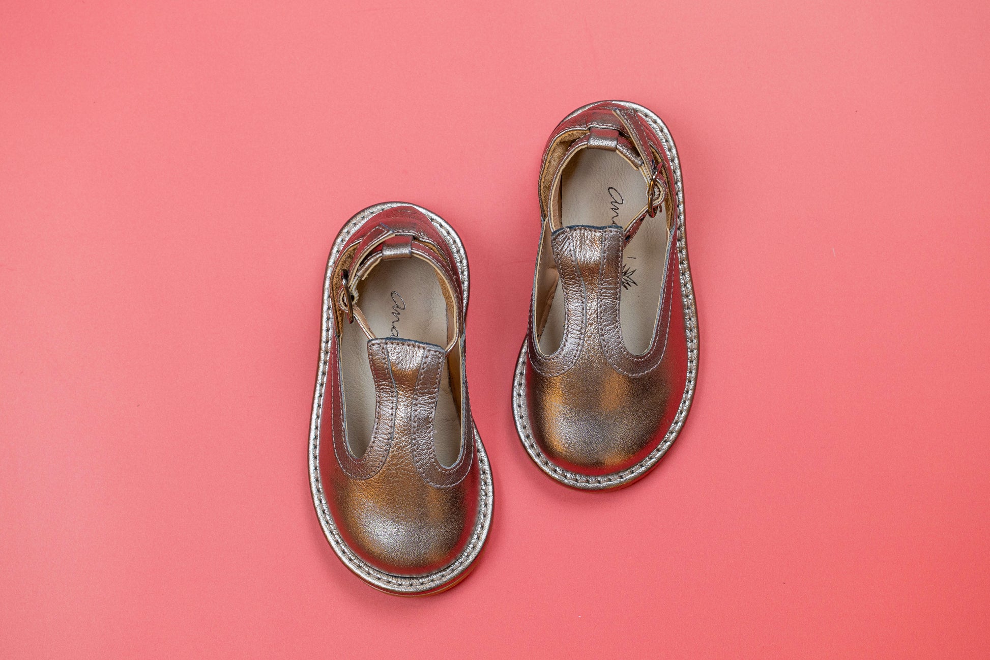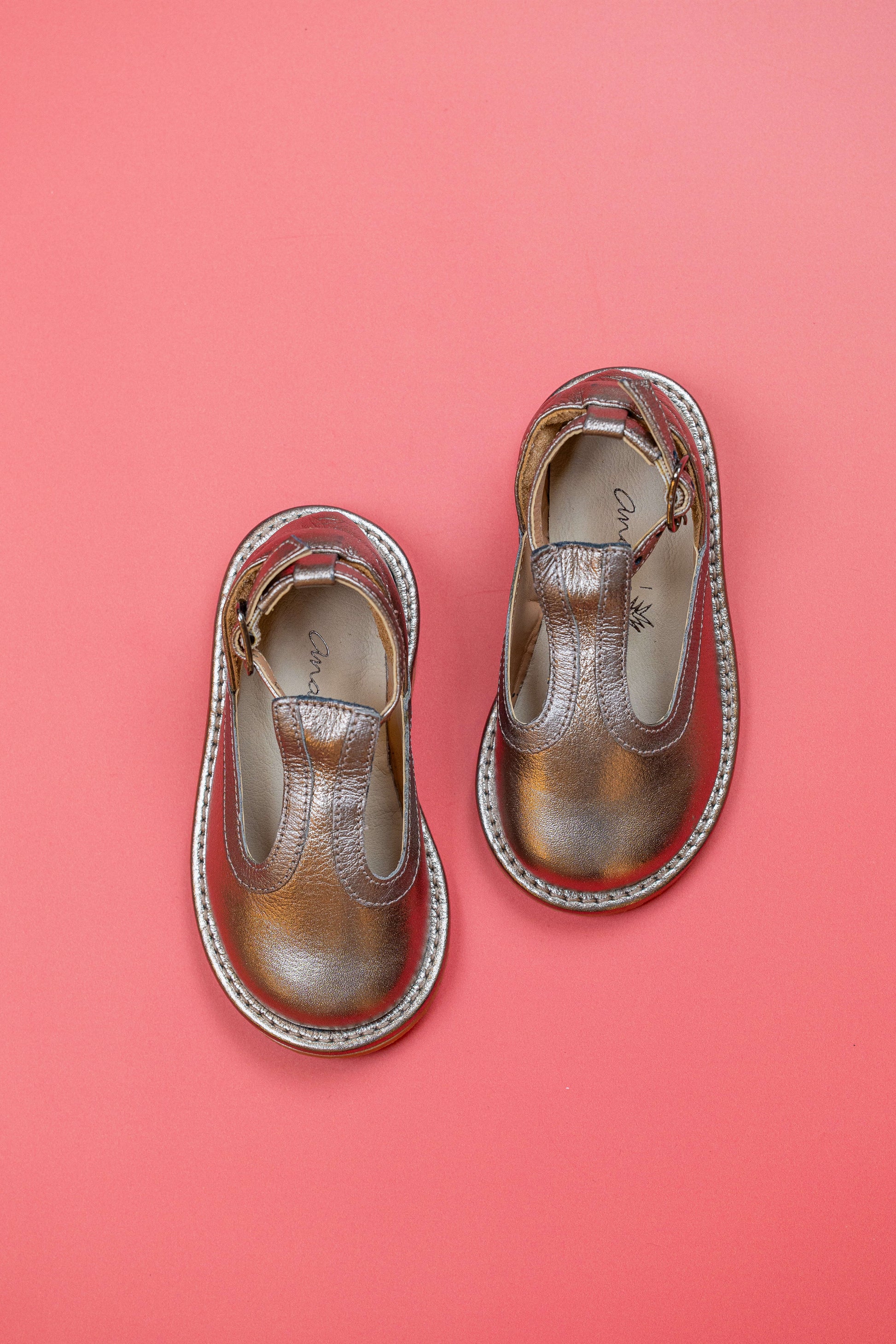 O modelo Diana é um sapatinho fechado e elegante, com recortes sofisticados e um visual encantador. Feito para meninas que gostam de brilho e delicadeza, ele brinca com o contraste entre o couro dourado e prata, criando um efeito único e cheio de charme. O coração na parte superior completa o design com um toque lúdico e especial.